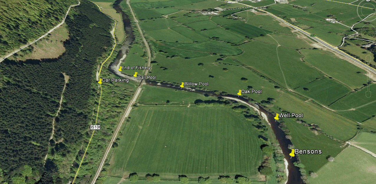 Wall Pool . Marks the end of the Fishery for Gwydyr Fishery Waters.